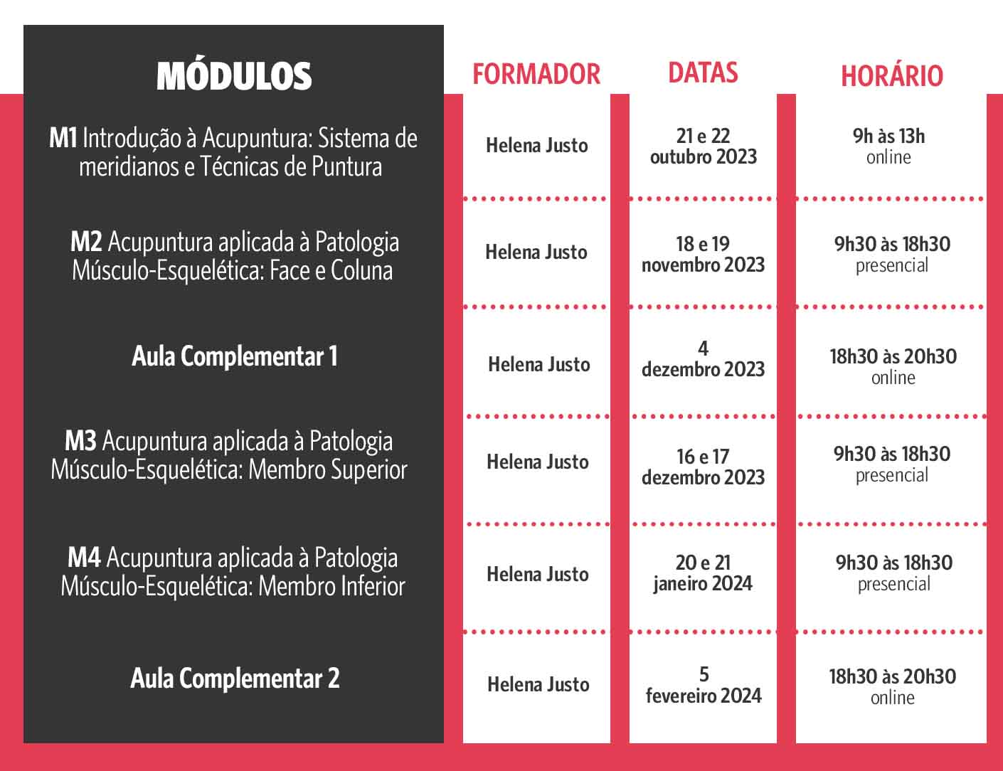 • Vou integrar um curso com muita prática, vivenciando uma experiência multifactorial, na qual terei acesso direto à formadora Helena Justo, com uma vasta experiência clínica, especialista em Medicina Chinesa e uma das formadoras com melhor avaliação por parte dos alunos, numa lógica de aprendizagem bilateral e networking;