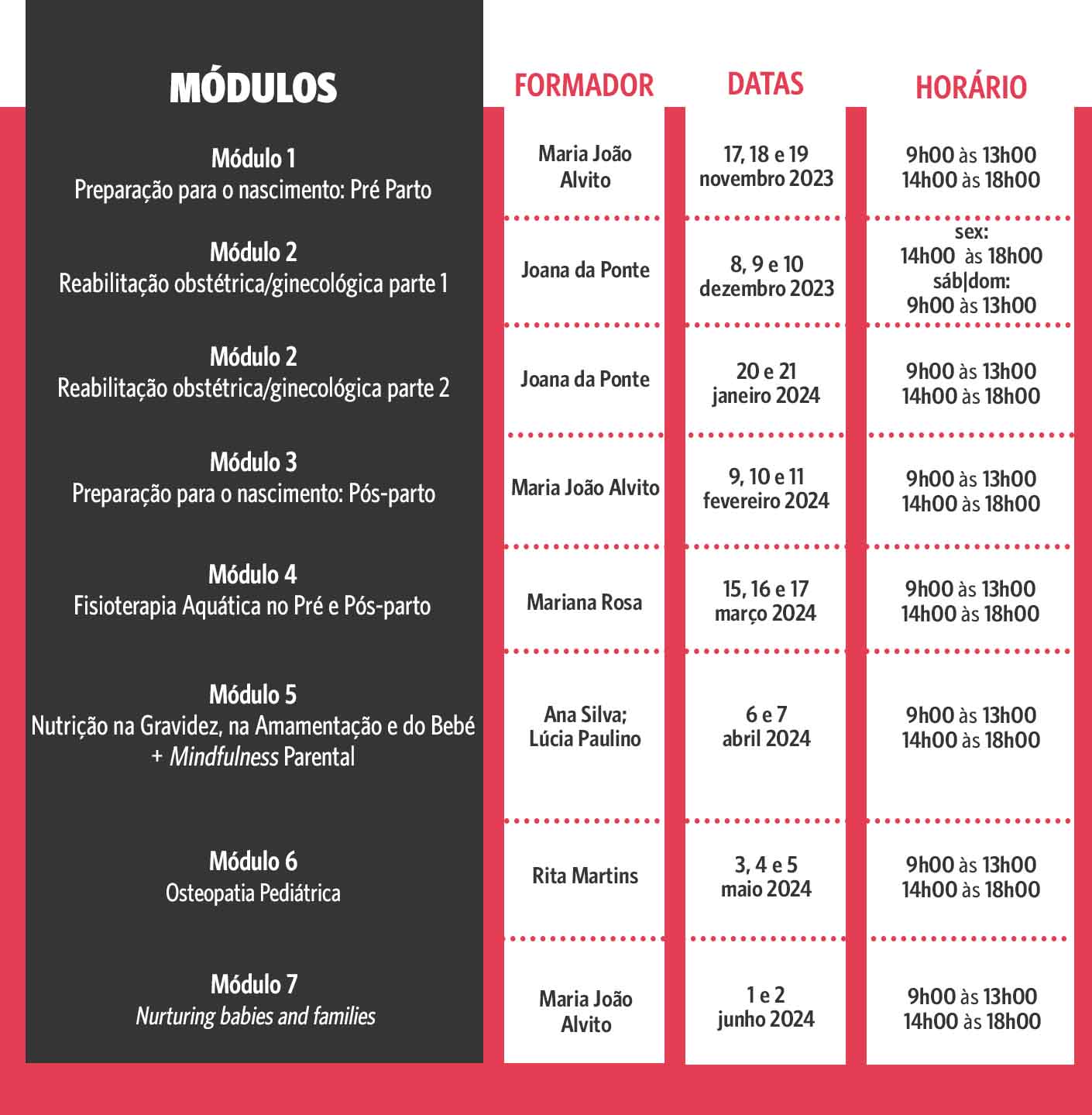Através de 7 Módulos formativos com a duração total de 164 horas de contacto formador/formandos desenvolvem-se conteúdos programáticos abrangentes da gravidez, pré e pós parto, desenvolvimento do bebé 1º ano de vida.