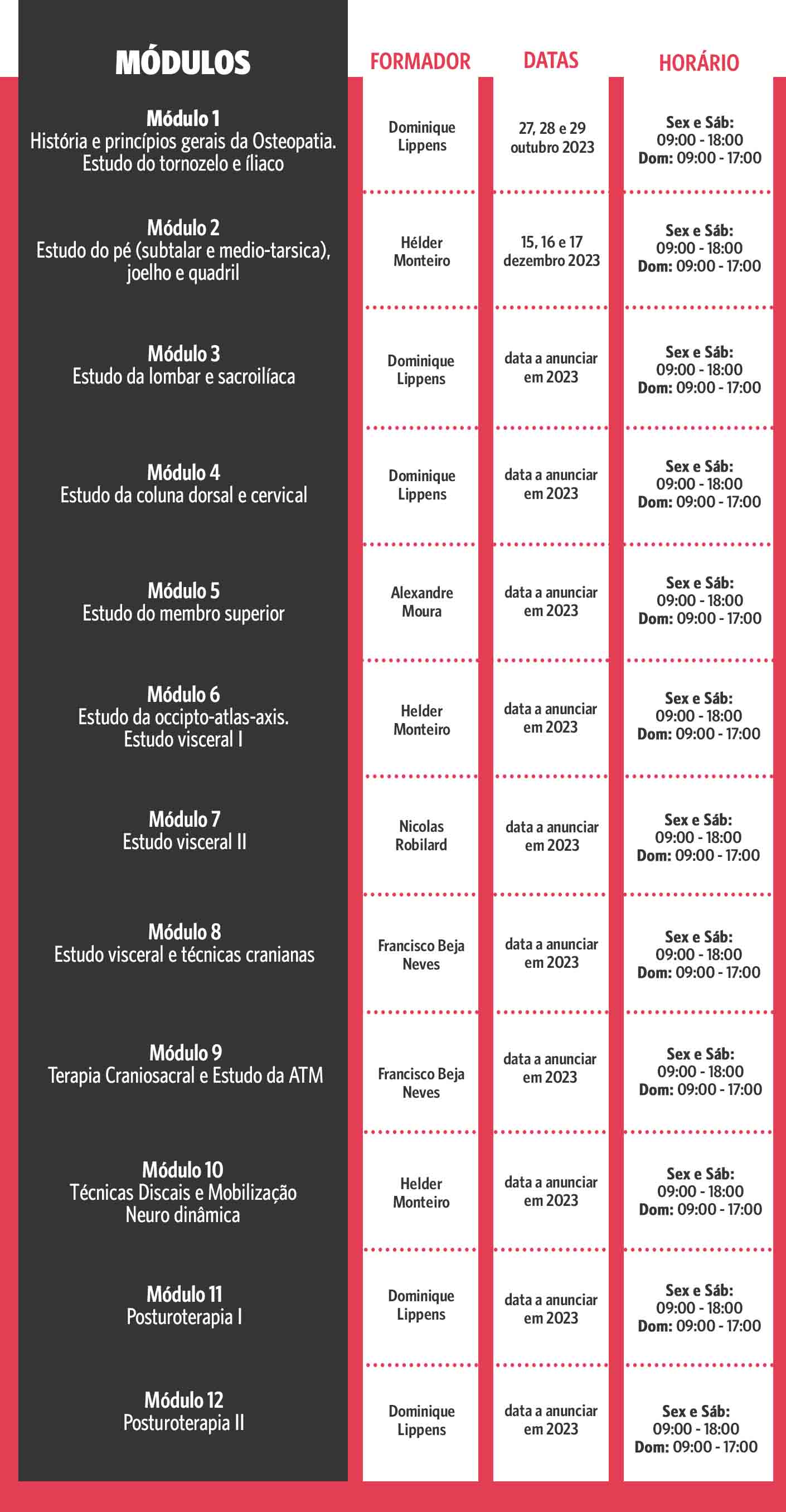 Apenas nesta formação, dada também pelo próprio Dominique Lippens, criador do Conceito Osteotiopático, vai adquirir algumas das melhores técnicas da Terapia Manual, como por exemplo Cadeias Musculares, Cinesiologia Aplicada, Quiropraxia ou Posturologia, partindo da Osteopatia e da experiência clínica de dezenas de anos dos seus formadores.